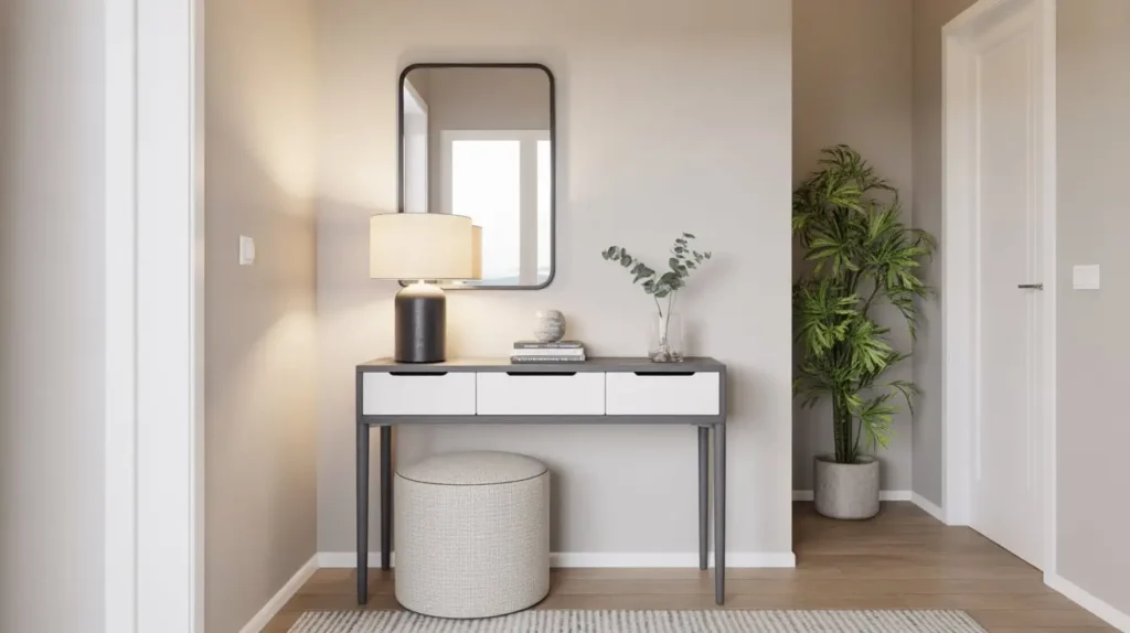 Slim console tables exist specifically for people like us. I’m talking about those impossibly narrow tables (some are only 8-10 inches deep) that tuck against the wall and barely register as furniture.