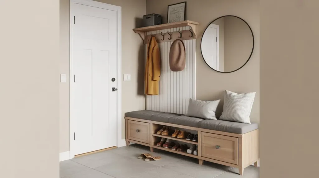A small storage bench serves double duty: it gives you a place to sit while putting on shoes AND hides the shoe chaos inside. This is what I call functional furniture that doesn’t apologize for existing in your space.