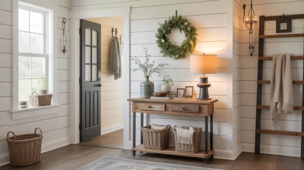 This look combines rustic elements with clean lines, and it’s shockingly easy to achieve on a budget. Think shiplap (or the peel-and-stick version for renters), neutral colors, and natural textures.
