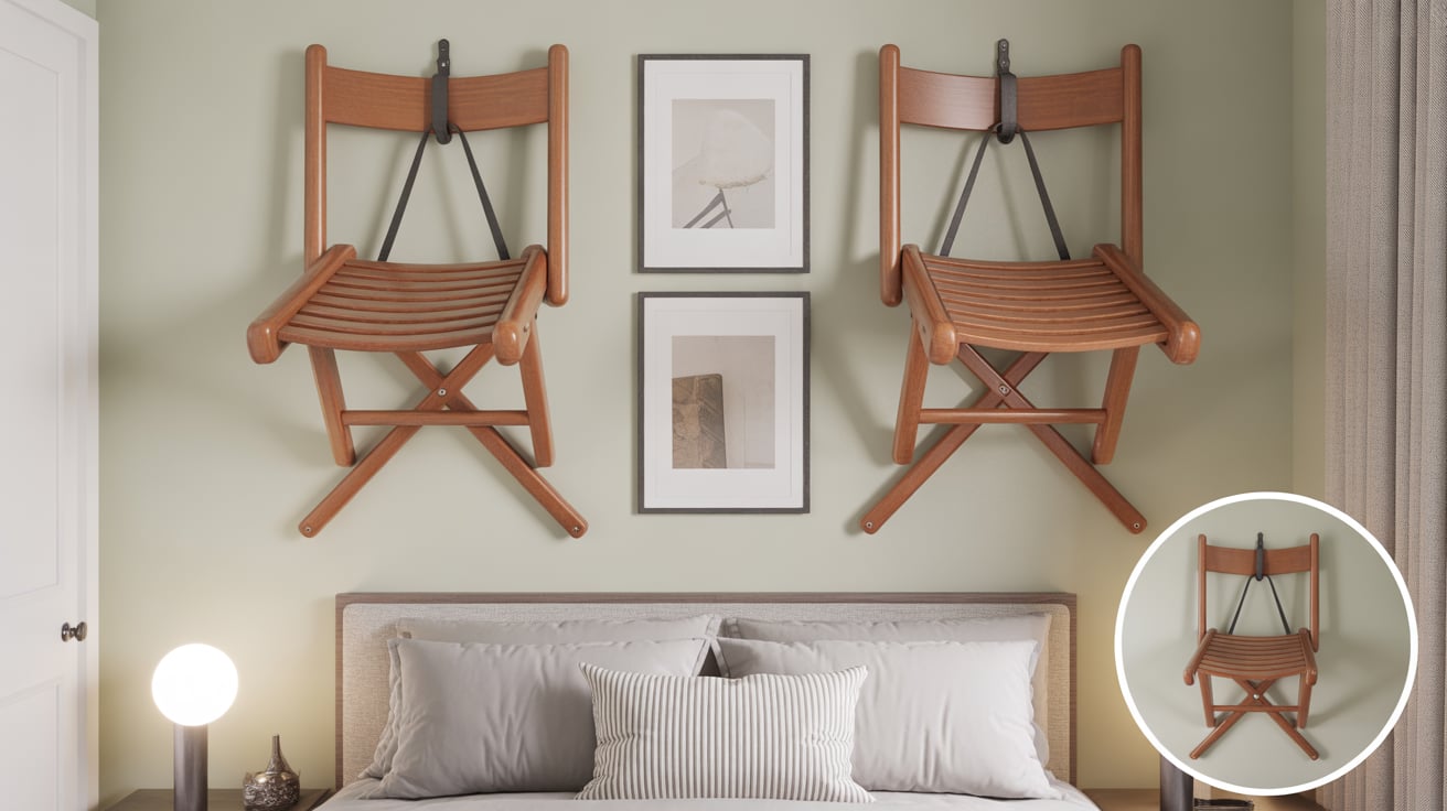 Wall-mounted chairs work because they free up floor space and double as wall art. Pick high-quality wood and pair with hooks that are sturdy yet stylish. Perfect for minimalist, multi-functional rooms.