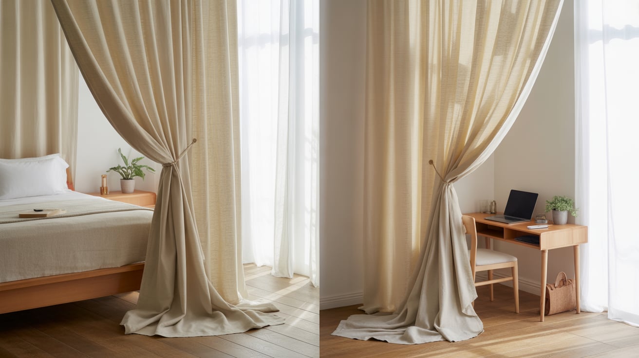Curtain dividers work because they create separation without walls. Use light, flowing fabrics to keep the room airy and add elegance. Perfect for shared spaces or multi-purpose rooms.