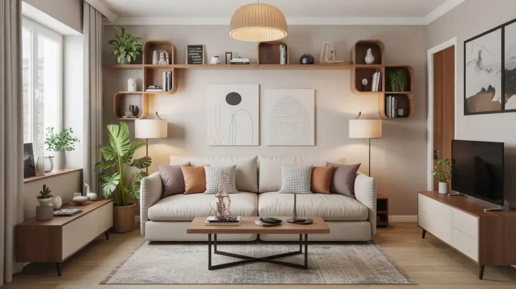 Floating shelves are basically magic for small living rooms. They provide storage and display space without the visual weight of traditional bookcases or cabinets.