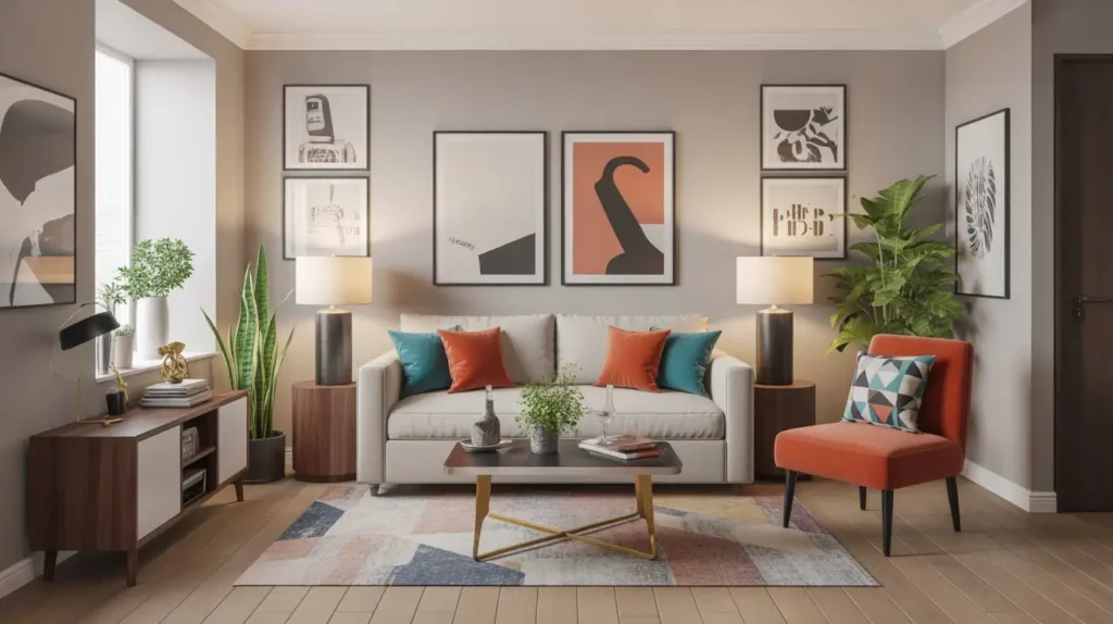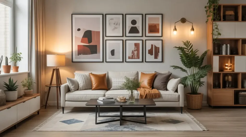 Size matters too. In a small living room, you want your gallery wall to be proportional. A tiny cluster of 4×6 photos on a big wall looks lost, but a well-planned arrangement of medium-sized pieces can be stunning.