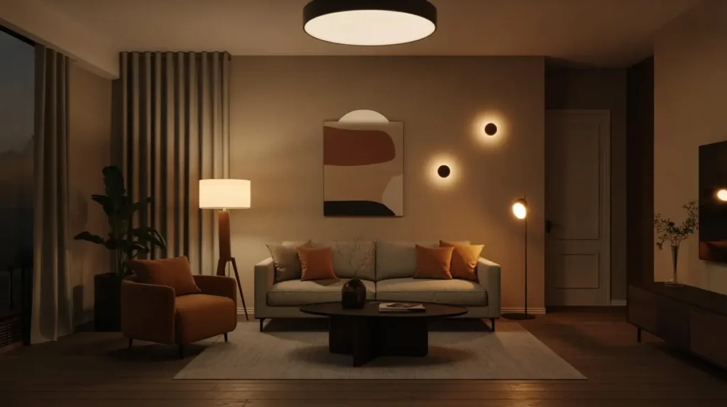 Task lighting comes from floor lamps next to your reading chair, table lamps on side tables, or that desk lamp you use when paying bills. These create pools of light that define different zones within your living room.