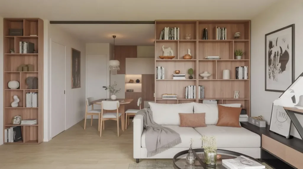 Open-concept living sounds great until you realize your living room, dining area, and entryway are all just… one big undefined blob. Sliding door bookcase dividers let you define spaces without building permanent walls that chop up your square footage.
