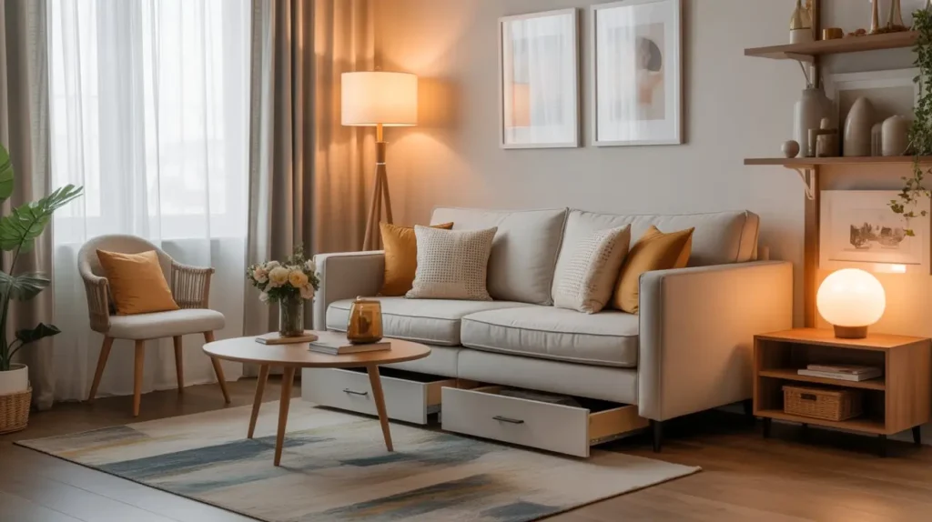 First, make sure your sofa has adequate clearance—you need at least 4-5 inches for most storage solutions. Those low-profile, floor-sitting sofas we talked about avoiding earlier? This is another reason why they’re not ideal for small spaces. You lose valuable storage real estate.