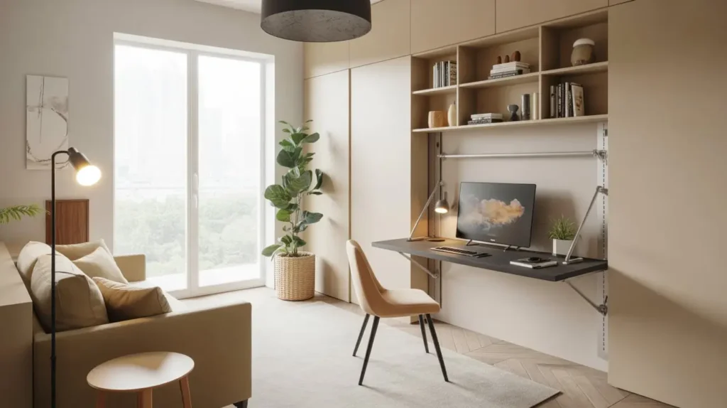 Working from home in a small apartment means your “office” is probably wherever you can balance your laptop. Wall-mounted fold-out desks give you a real workspace that completely disappears when you’re done.