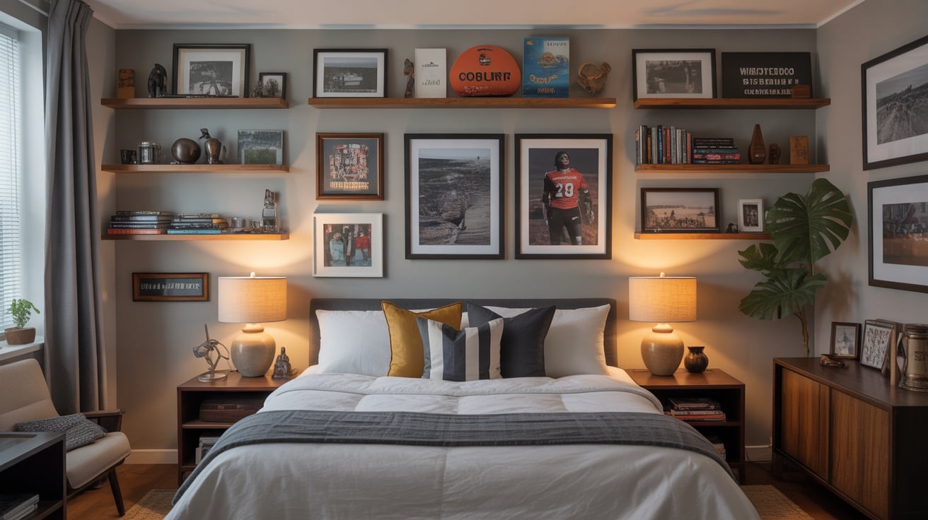 Art works because it draws attention away from size limitations and showcases your style. Even one large piece or a gallery wall can elevate the aesthetic. Personal photos, posters, or abstract paintings all work well in masculine spaces.