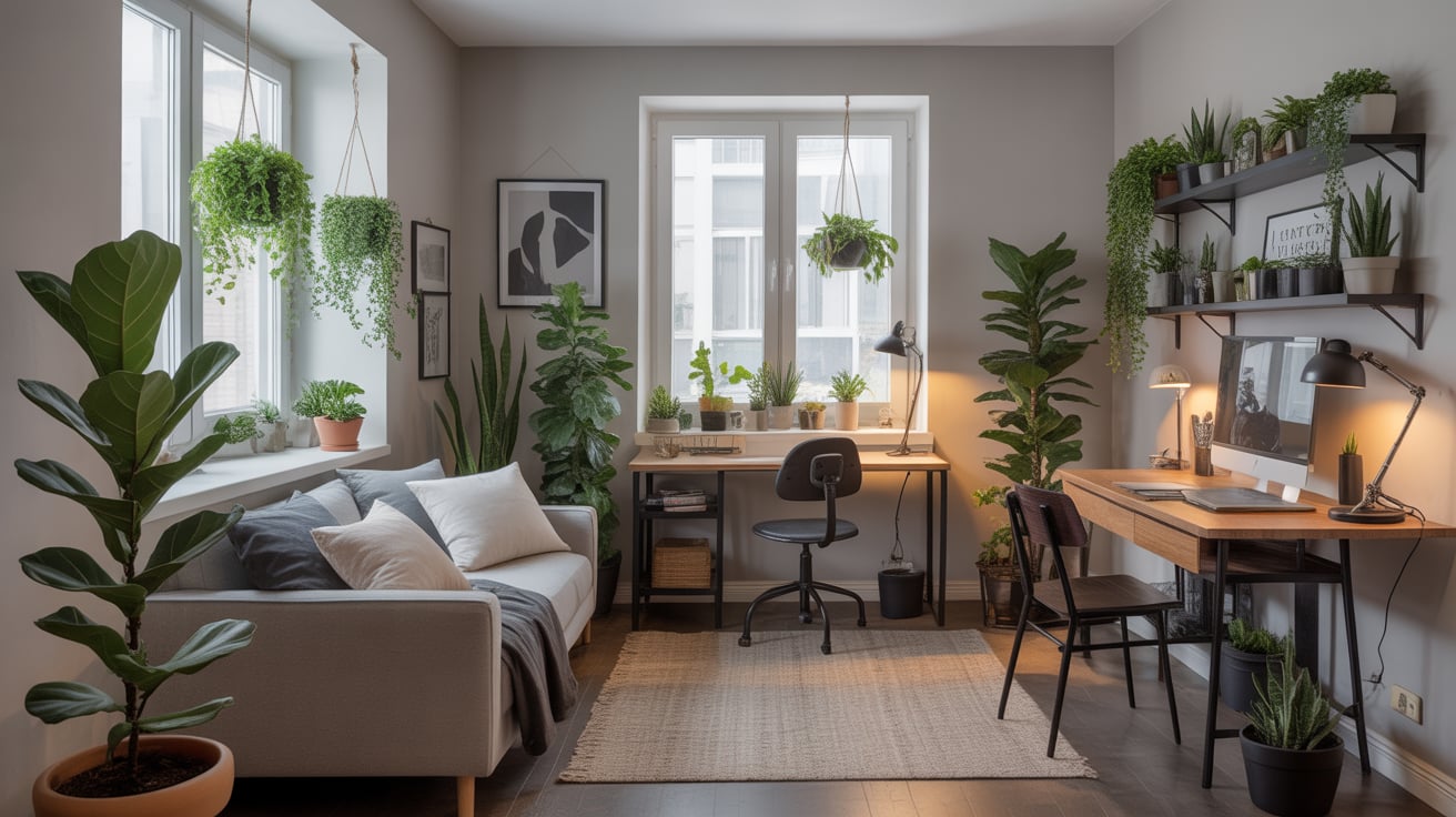 Plants work because they break up the monotony of furniture and walls, add texture, and bring life to compact spaces. They’re especially effective in minimal or industrial studios, softening the look and creating balance.