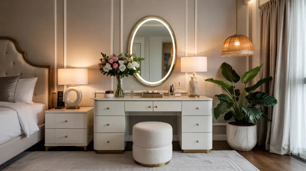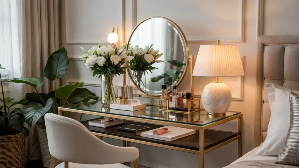 Balance is crucial when working with statement pieces. If your mirror is elaborate and ornate, keep the vanity table simple. Let each element shine rather than competing for attention. The overall composition should feel intentional and cohesive, not chaotic.