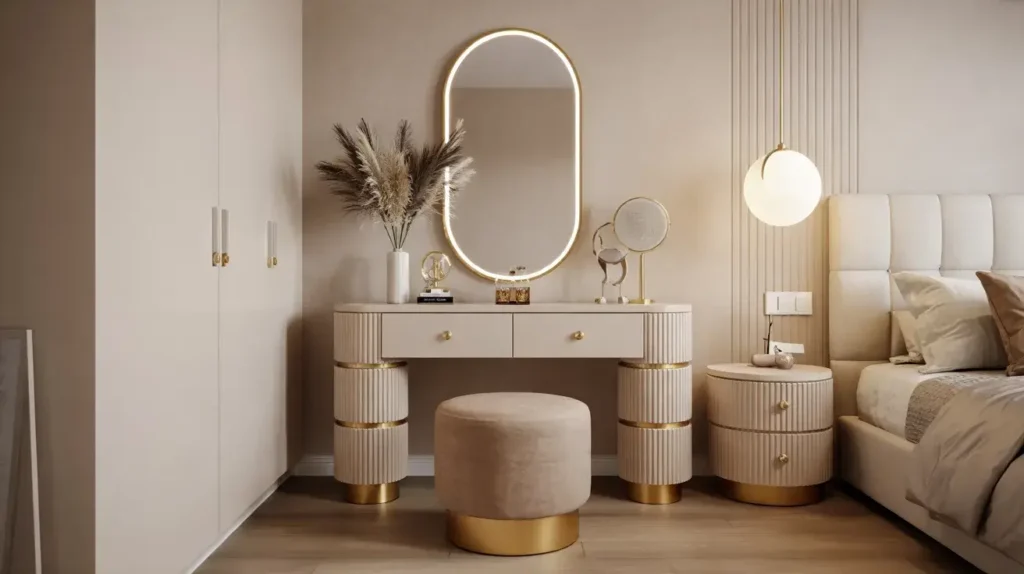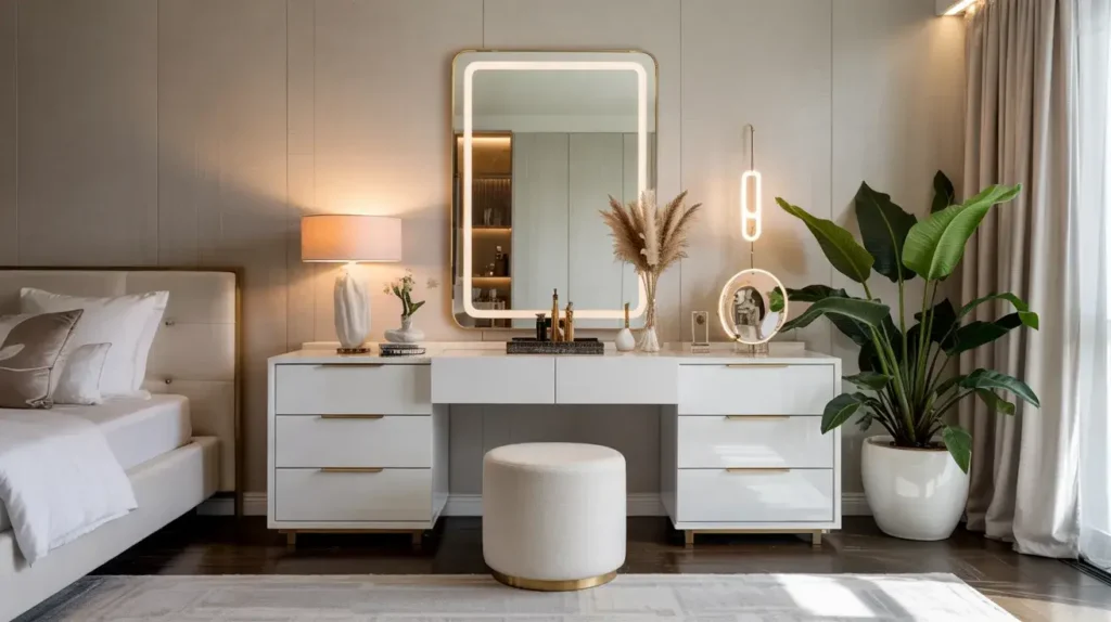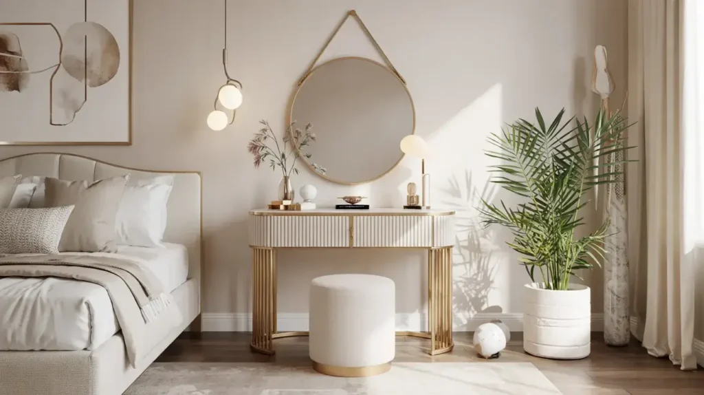 Minimalism meets glamour—sounds contradictory, but when you nail this combination, magic happens. A sleek dressing table with delicate gold framing gives you that “less is more” aesthetic while still feeling utterly luxurious.