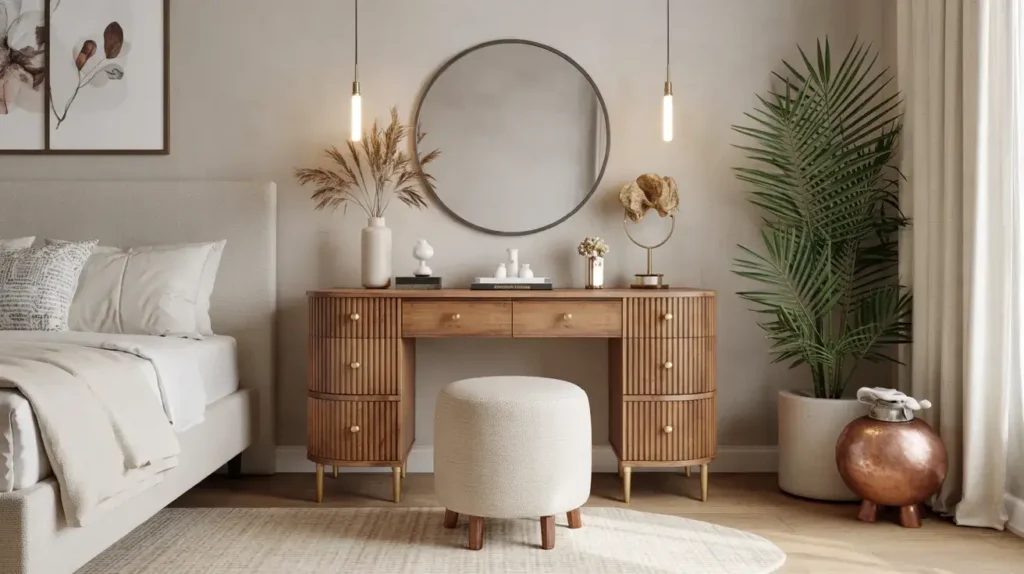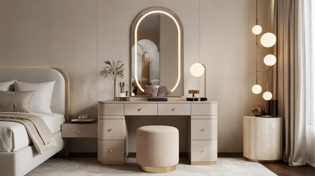 I’ve seen statement mirrors completely change bedroom energy. What was once a bland, forgettable space suddenly has personality, drama, and serious style credibility. The vanity table beneath almost becomes secondary—a supporting player to the mirror’s starring role.