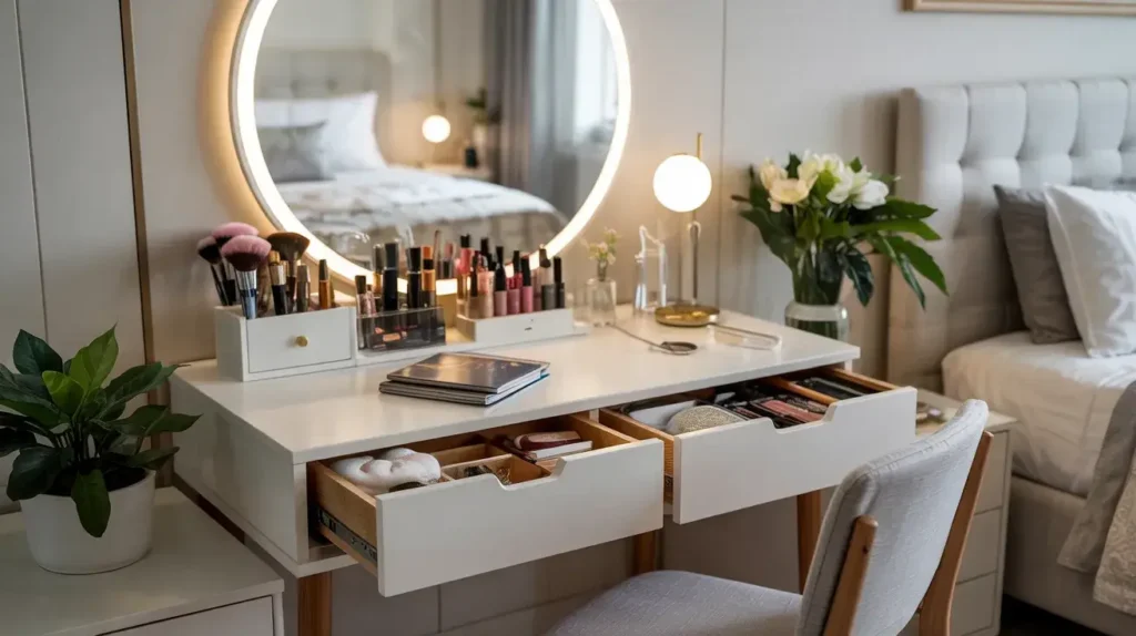 You want to know what real luxury is? A vanity table that hides all your clutter while looking serene and beautiful on the surface. I used to have makeup and products everywhere until I invested in a vanity designed with serious storage in mind.