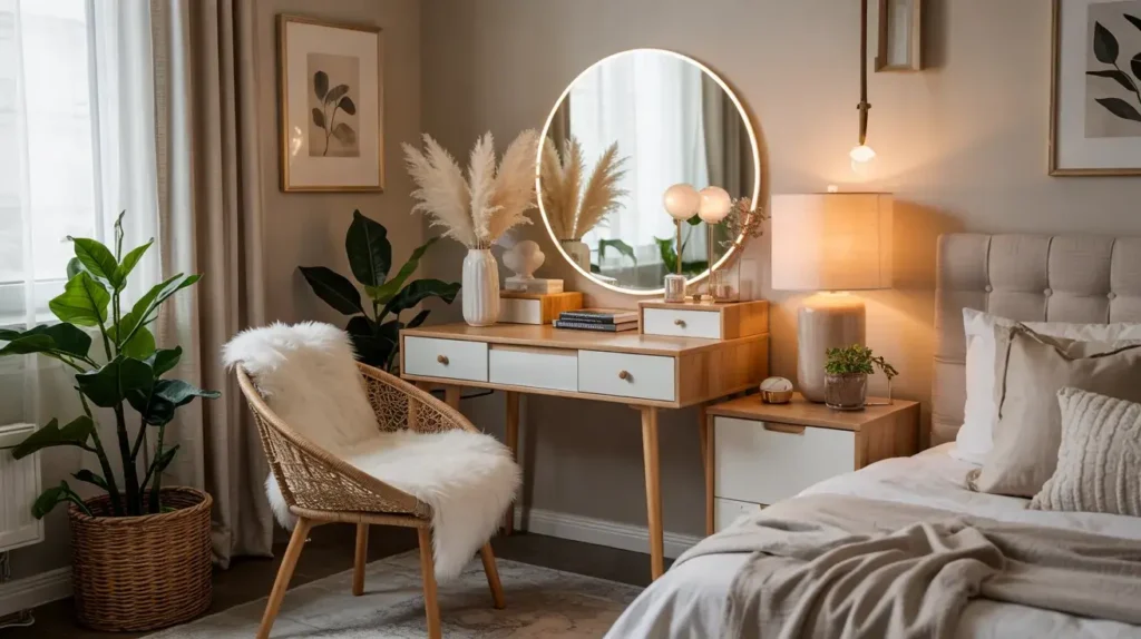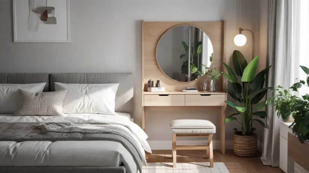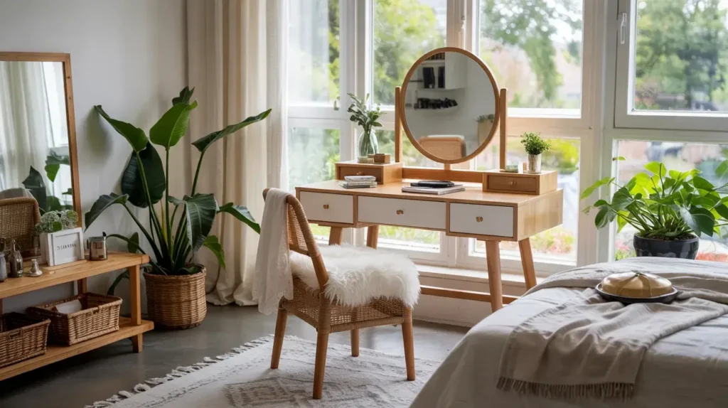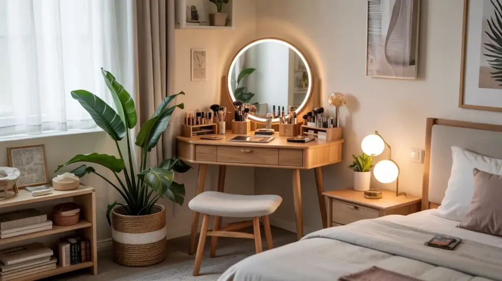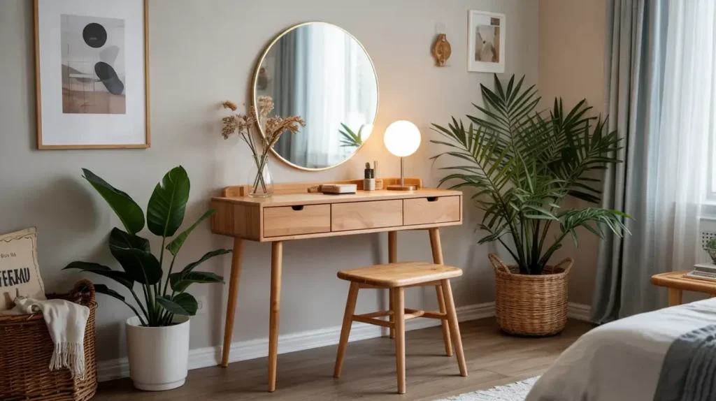 I set up my Scandinavian vanity with clean lines, minimal ornamentation, and lots of negative space. The light wood reflects natural light beautifully and makes my bedroom feel bigger and brighter. It’s luxury through simplicity and quality materials.