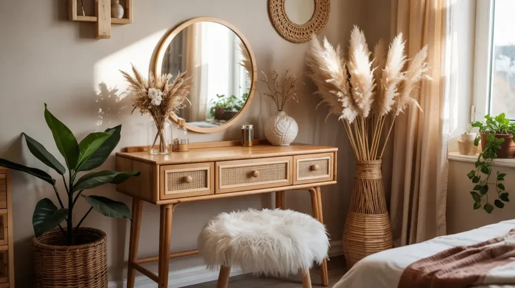 The luxury element comes from layering textures and natural materials. I combined my rattan vanity table with a round rattan mirror, added some terracotta pots with trailing plants, and threw a vintage Turkish rug underneath. The whole setup feels expensive because it’s thoughtfully curated, not matchy-matchy.