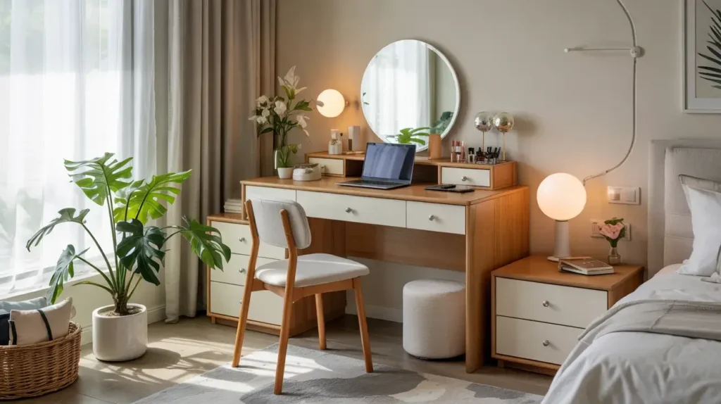 Let’s talk about maximizing function without sacrificing style. A desk-vanity combo gives you workspace during the day and glam station in the evening. I set this up when I started working from home, and it’s been perfect.