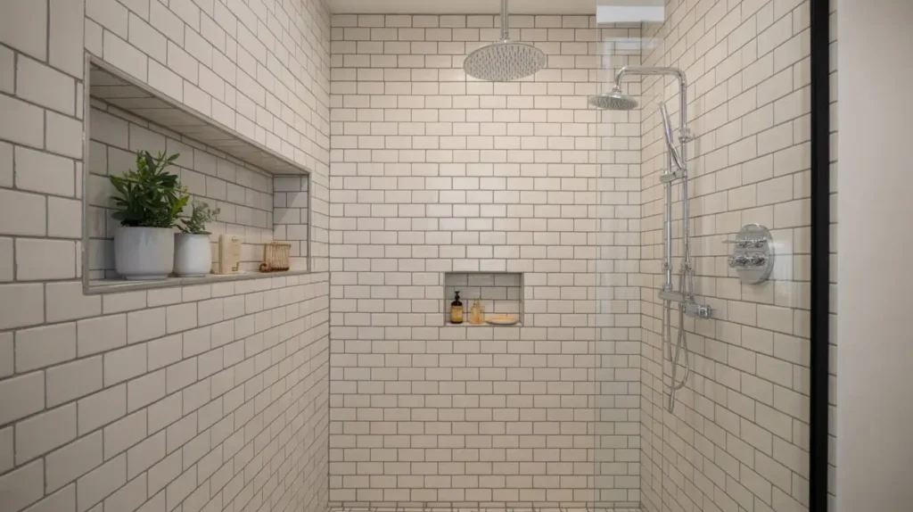 Okay, let’s zoom in on something specific—shower niches. If you’re tiling a shower, you absolutely need to incorporate a niche (or two!), and white subway tiles give you tons of creative options here.