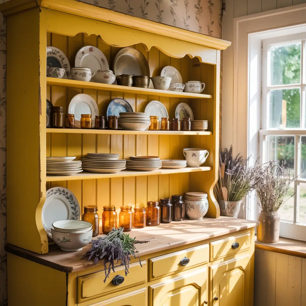 Once you’ve got your hutch, paint it yellow, distress it slightly for that authentic farmhouse feel, and style it with intention. Group items in odd numbers, vary heights, and don’t overcrowd the shelves. Less is more, even when you’re working with a statement piece.