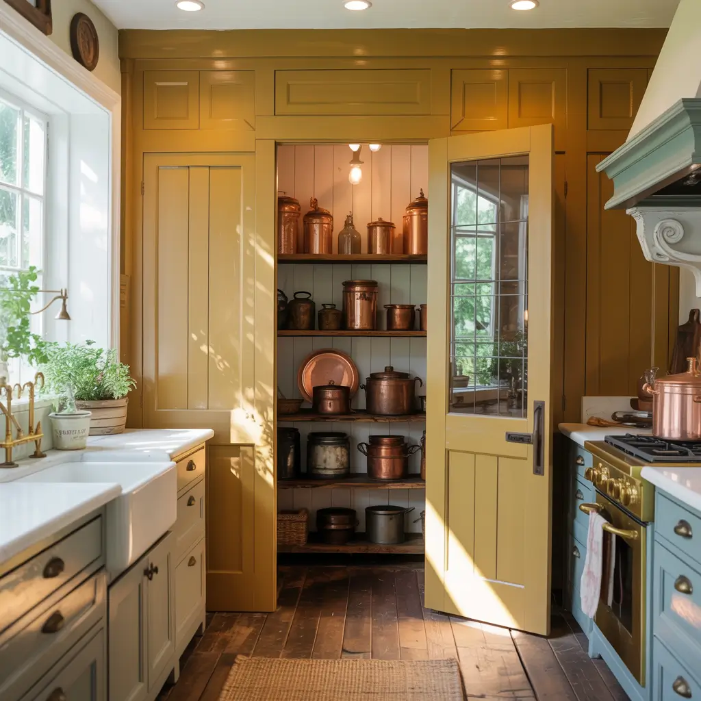 Everyone obsesses over cabinets and walls, but pantry doors are seriously underrated. If you’ve got a small kitchen with a pantry closet, painting those doors mustard yellow creates an unexpected pop of color that doesn’t overwhelm.