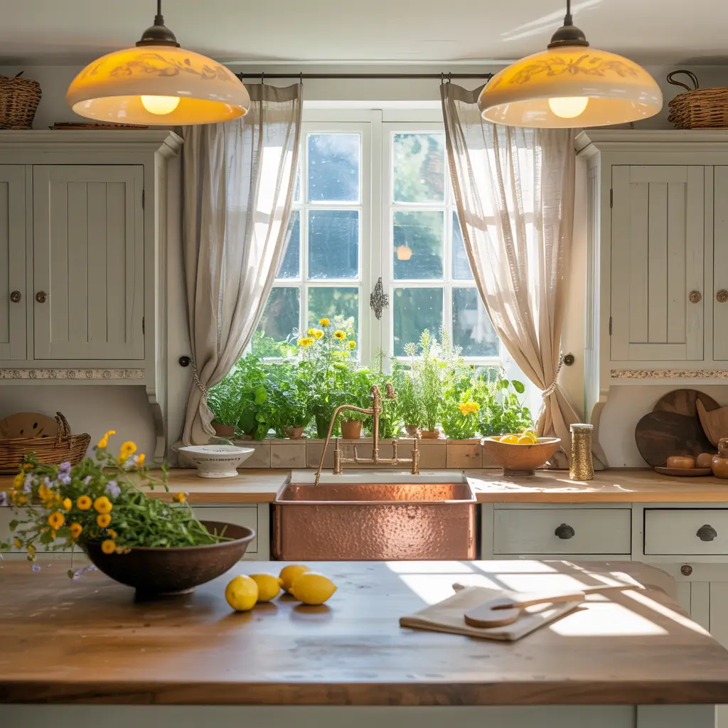 Lighting serves double duty: it’s functional (you need to see what you’re chopping), and it’s decorative. Yellow farmhouse lighting fixtures draw the eye upward, which is a brilliant trick in small kitchens because it makes the space feel taller.