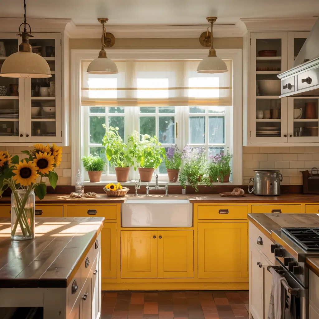 Yellow window trim frames your views and draws attention to natural light sources—crucial in small kitchens where every bit of brightness counts. Pair it with rustic farmhouse curtains in linen, burlap, or simple cotton, and you’ve created a focal point that costs virtually nothing.